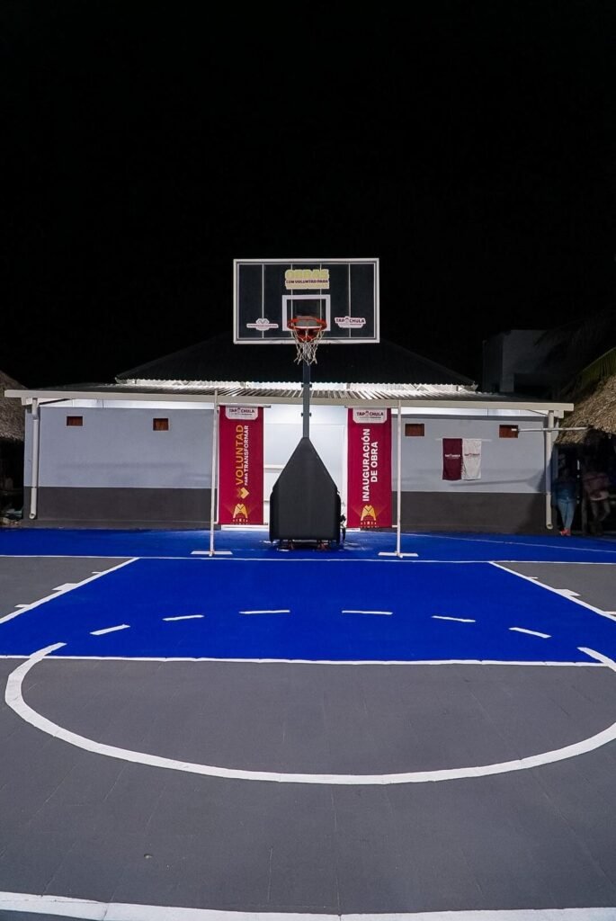 Como parte de las acciones integrales se realizó la aplicación de pintura antiderrapante en la cancha deportiva, la colocación de 2 tableros con base movible para básquetbol, 2 porterías movibles para fútbol y la instalación de 6 postes con lámparas solares de 100 watts, con lo que se mejora la iluminación y se promueve el uso seguro del espacio en horarios nocturnos.