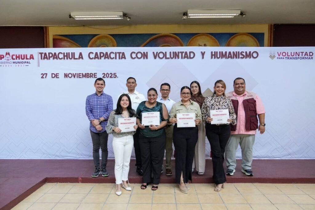El Ayuntamiento de Tapachula, a través de la Oficialía Mayor y el Departamento de Capacitación y Desarrollo Municipal, llevó a cabo con éxito la clausura de la Jornada de Capacitación «Tapachula Capacita con Voluntad y Humanismo» el pasado 27 de noviembre de 2025. Durante la emotiva ceremonia, los servidores públicos recibieron constancias y reconocimientos por su compromiso en la inversión de tiempo y esfuerzo en su desarrollo personal y profesional, con el objetivo de servir a la ciudadanía con excelencia y calidez.