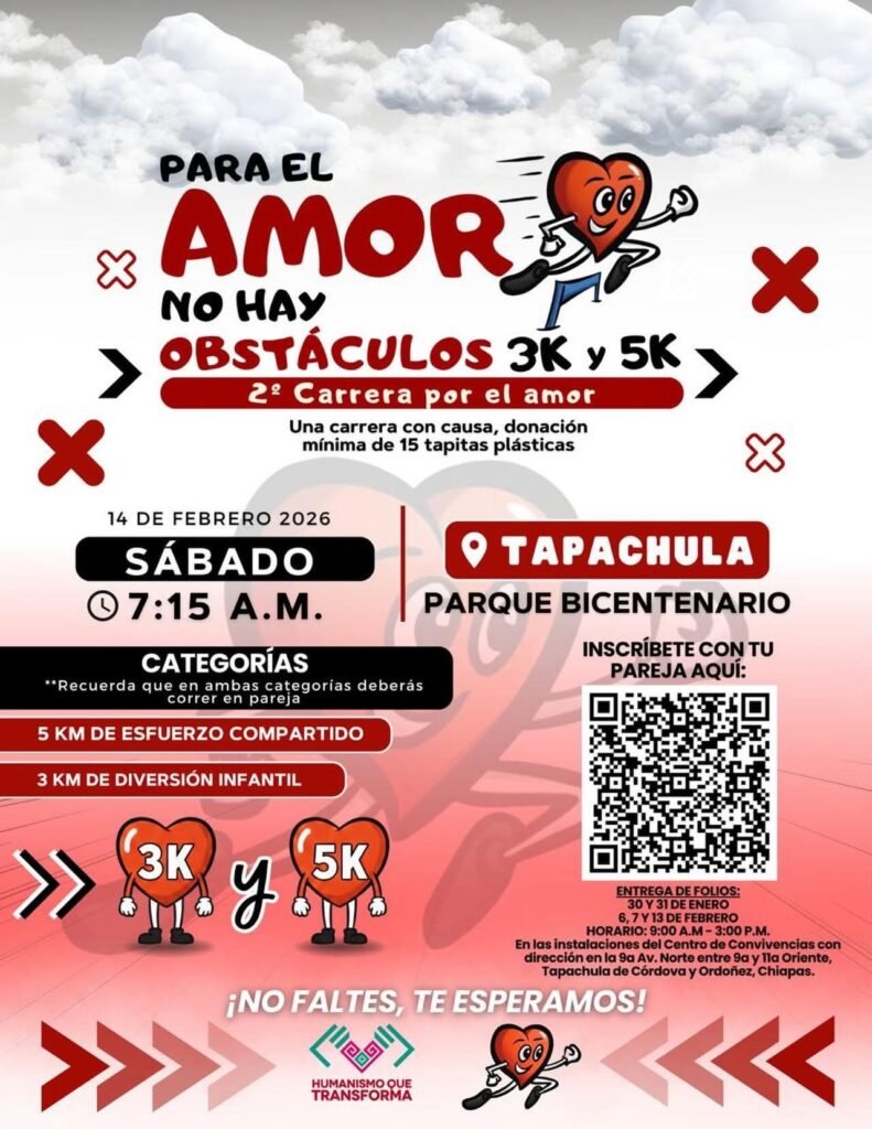 El Ayuntamiento de Tapachula participó en la rueda de prensa para dar a conocer la 2ª Carrera “Para el amor no hay obstáculos”, un evento con causa que contempla una carrera infantil recreativa de 3 kilómetros y una carrera de 5 kilómetros de esfuerzo compartido, con el objetivo de apoyar tratamientos oncológicos para niñas y niños con cáncer.